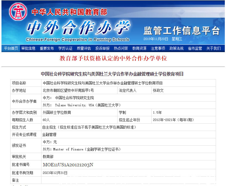 作为中国社会科学院大学(研究生院)首个中外合作办学项目,财务管理硕士项目已开办8年,已成功举办7 期。培养了一批民族金融行业的优秀专业人才。学生在职学习,学制18个月。毕业后可获得美国杜兰大学颁发的金融学硕士学位证书和教育部海外教育服务中心颁发的外国(海外)学历学位证书。其学位在国内和国际上都得到认可。